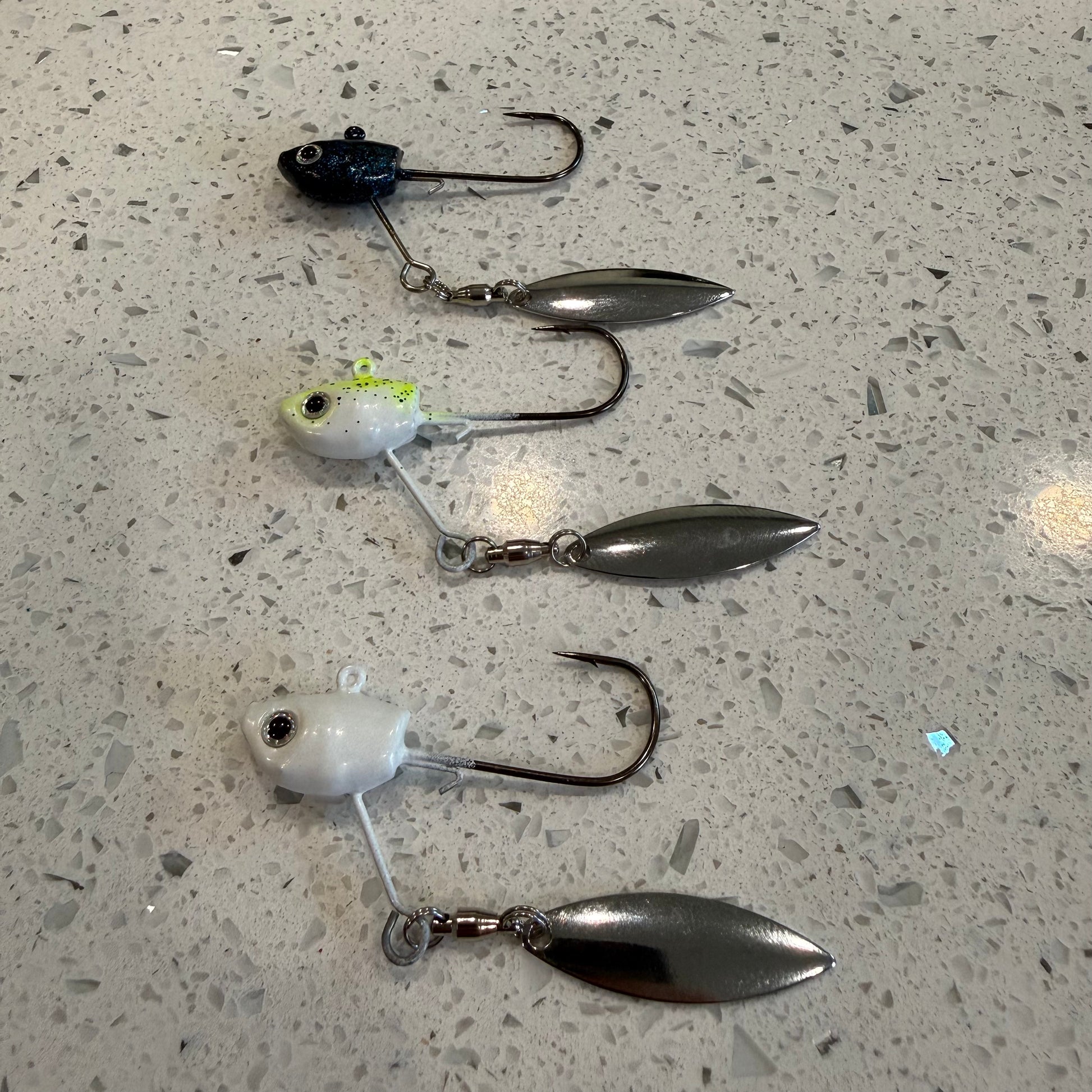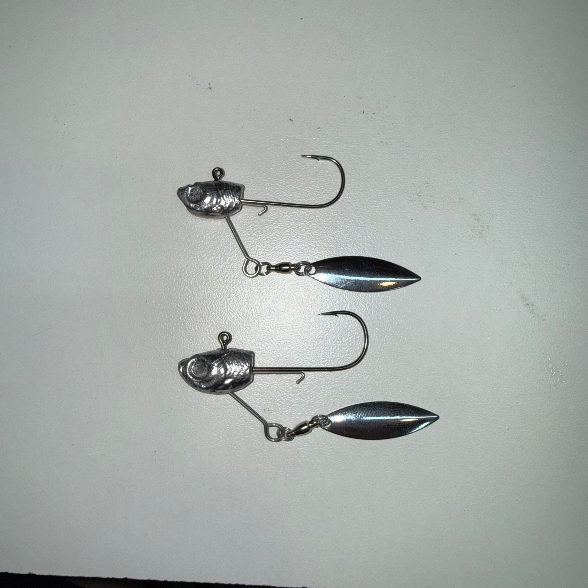 Each head features a premium ball-bearing swivel and polished willow blade that spins freely on the fall or retrieve, adding that irresistible flash predators can’t ignore. The wire bait keeper locks your soft plastic tight, keeping your presentation clean through grass, brush, and open water.
